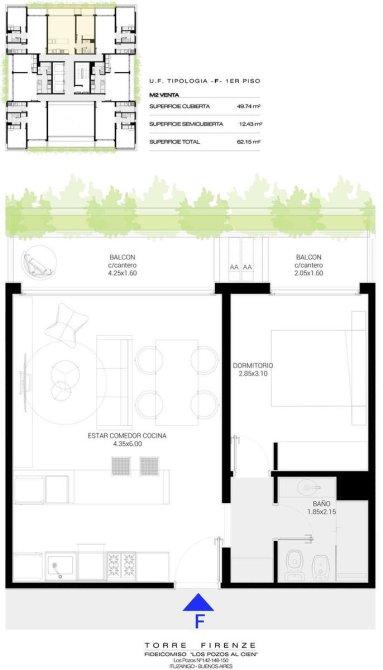 El proyecto Torre Firenze , se desarrolla sobre 9 pisos con unidades de 2 y 3 amb todas con cochera y balcón , cuenta con 2 subsuelos para un total de 66 cocheras y dos locales comerciales en planta baja.Del primero al sexto piso podremos encontrar todas unidades 2 ambientes de 53m2 a 62m2 aproximados y del séptimo al noveno piso unidades de 3 ambientes de 84m2 aproximados.