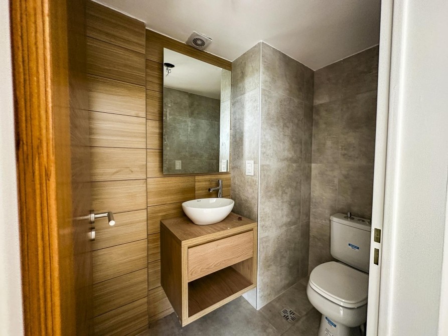 Se ingresa por cocina integrada al living comedor con muebles bajo mesada y a alacena, mesada de granito con bacha de acero inoxidable y grifería monocomando. Salida a balcón. Baño completo. Dos dormitorios con frentes de placard integral tipo americano en melamina, un dormitorio con toilette.
