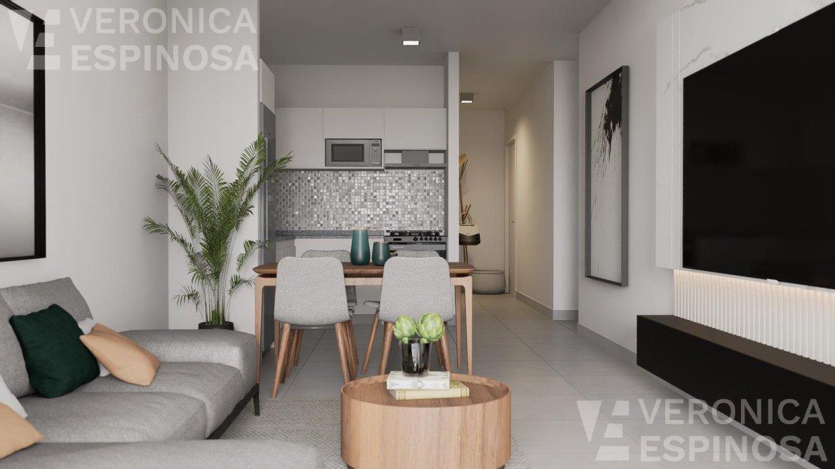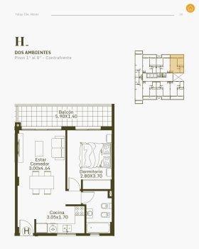 Ingresa por living-comedor, con salida a amplio balcón, cocina integrada, con mesada de mármol, bacha de acero inoxidable, grifería monocomando muebles bajo mesada, artefacto de cocina, termotanque eléctrico. Dormitorios con frente de placard. Baño completo con bañera, grifería de 1ra calidad.