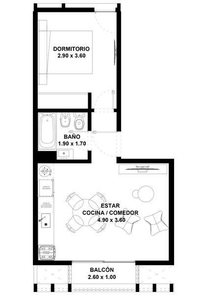 Dormitorio: Amplio y bien iluminado, con ventanales generosos que aseguran una excelente ventilación cruzada y una entrada abundante de luz. Incluye un placard completo para tus necesidades de almacenamiento.