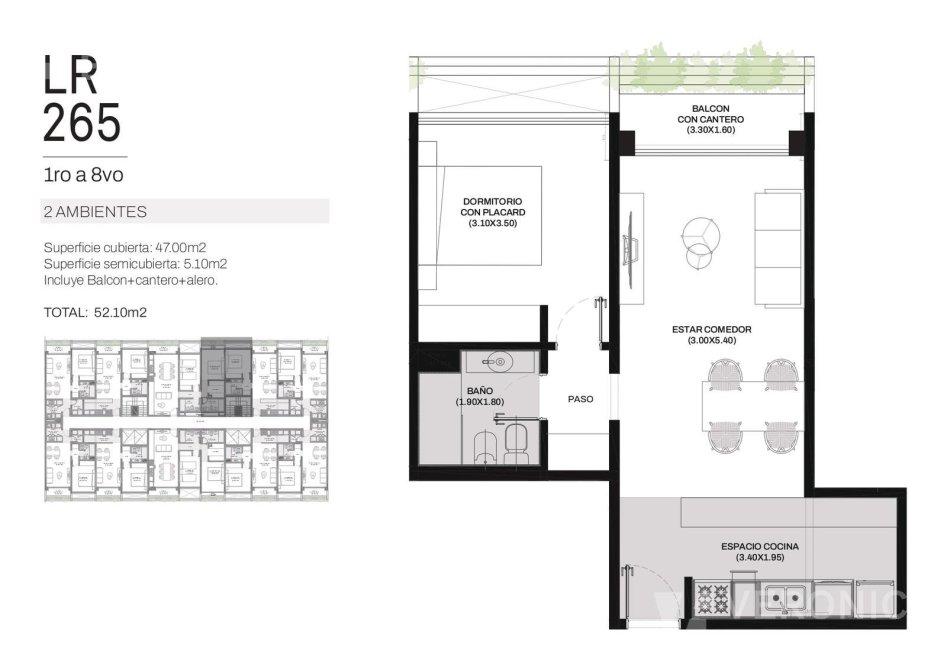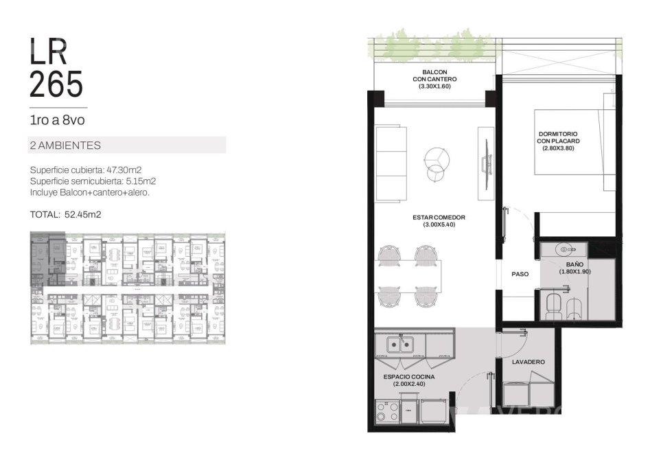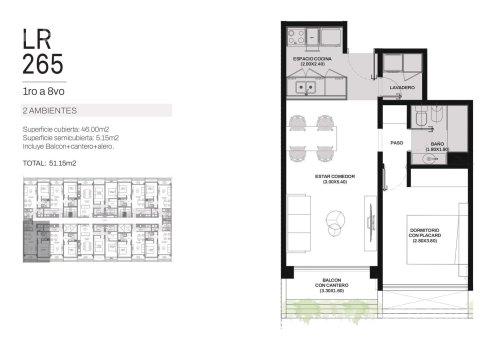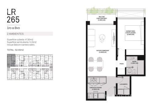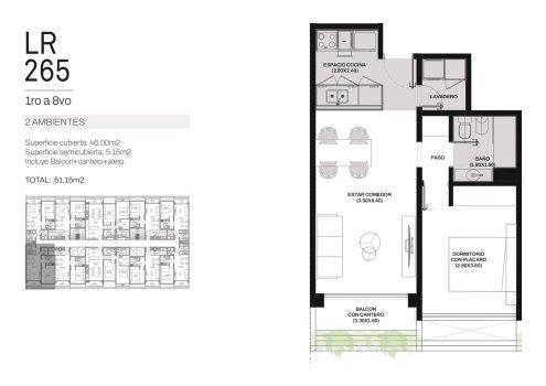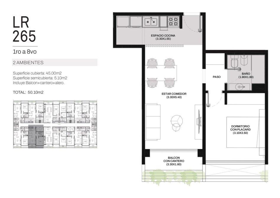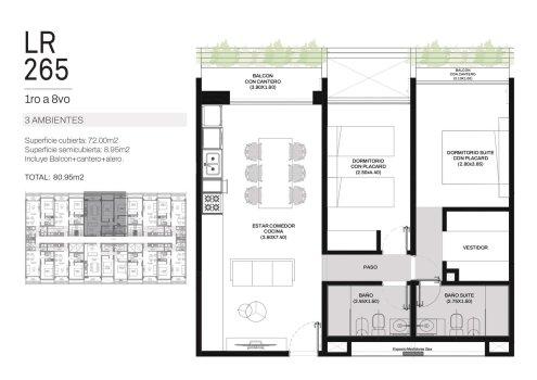 Ingreso por cocina semi integrada, living-comedor con salida a un amplio balcón, dos dormitorios con placar, uno de ellos en suite y baño completo con bañera.