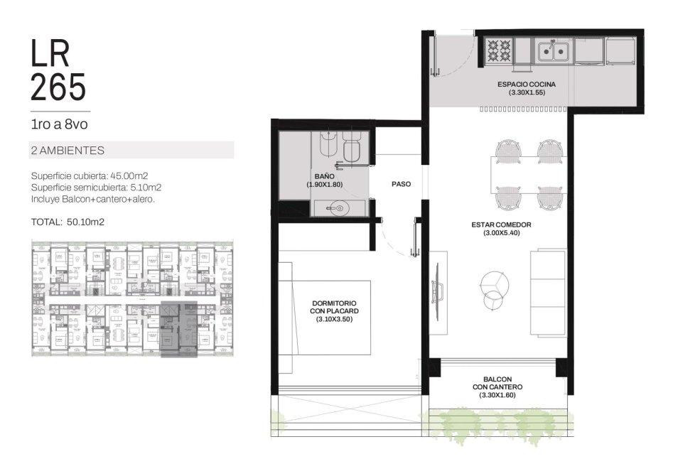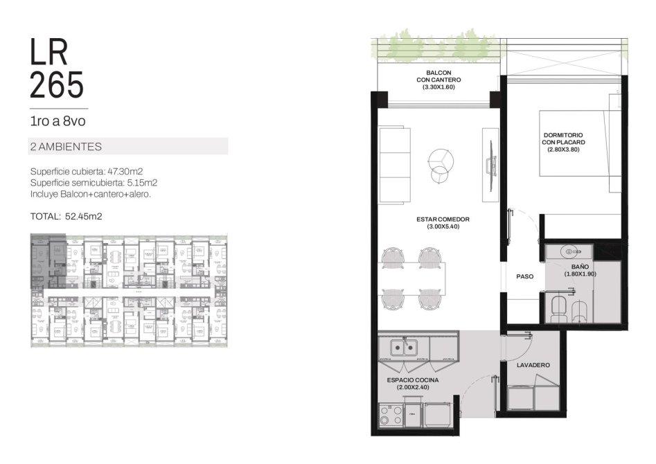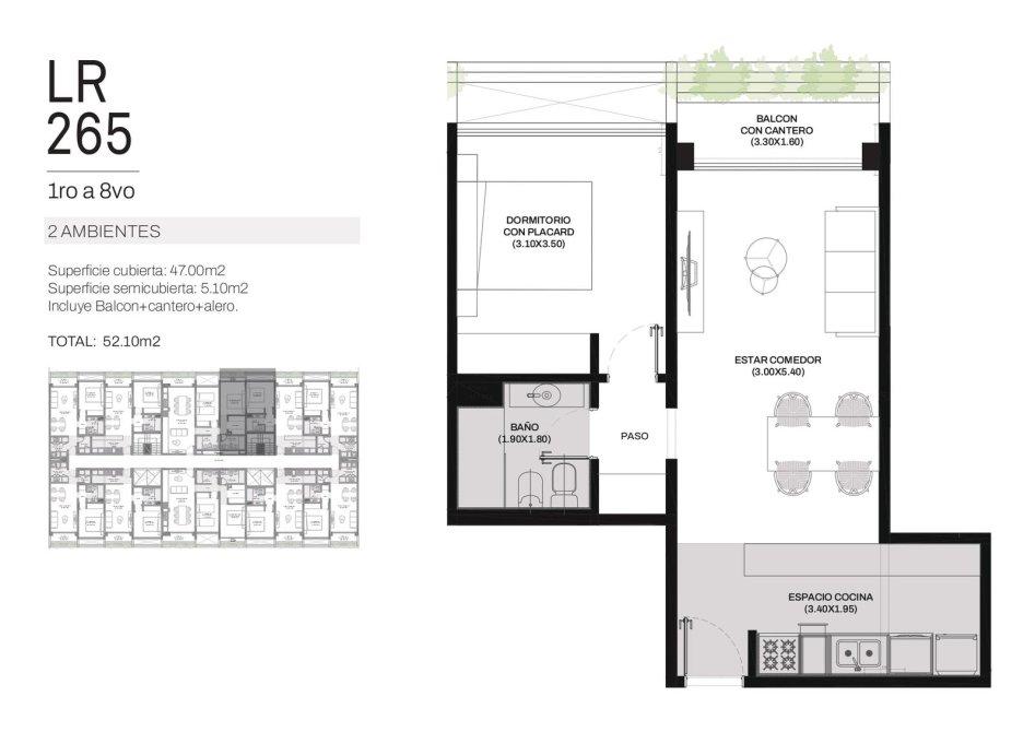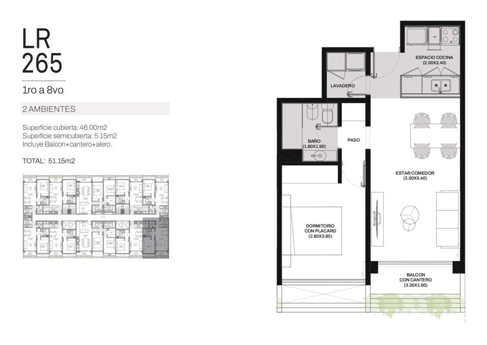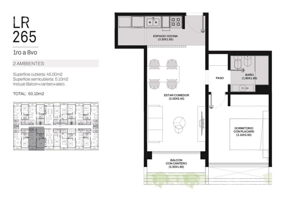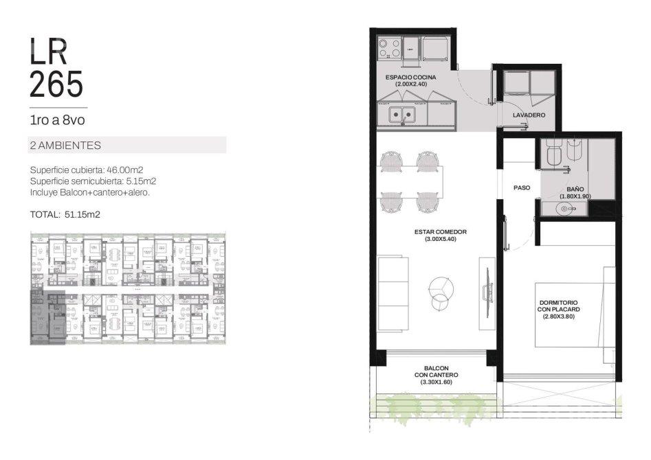 Ingreso por cocina semi integrada, living-comedor con salida a un amplio balcón, 2 dormitorios con placard, uno de ellos en suite y baño completo con bañera.