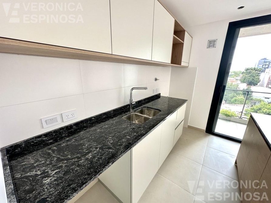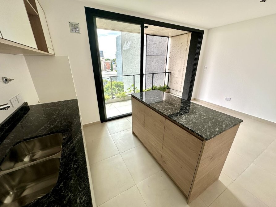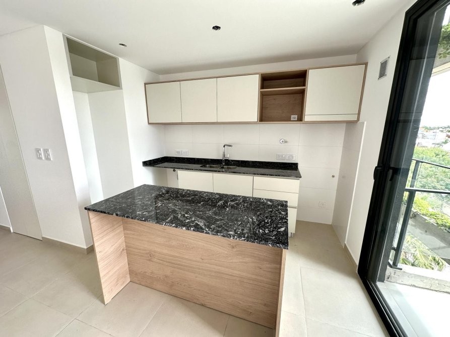 Al ingresar, se encuentra una amplia cocina-comedor equipada con muebles bajo mesada y alacena, mesada de granito gris mara, y grifería monocomando. Desde aquí, se accede a un balcón que ofrece espacio adicional al aire libre.