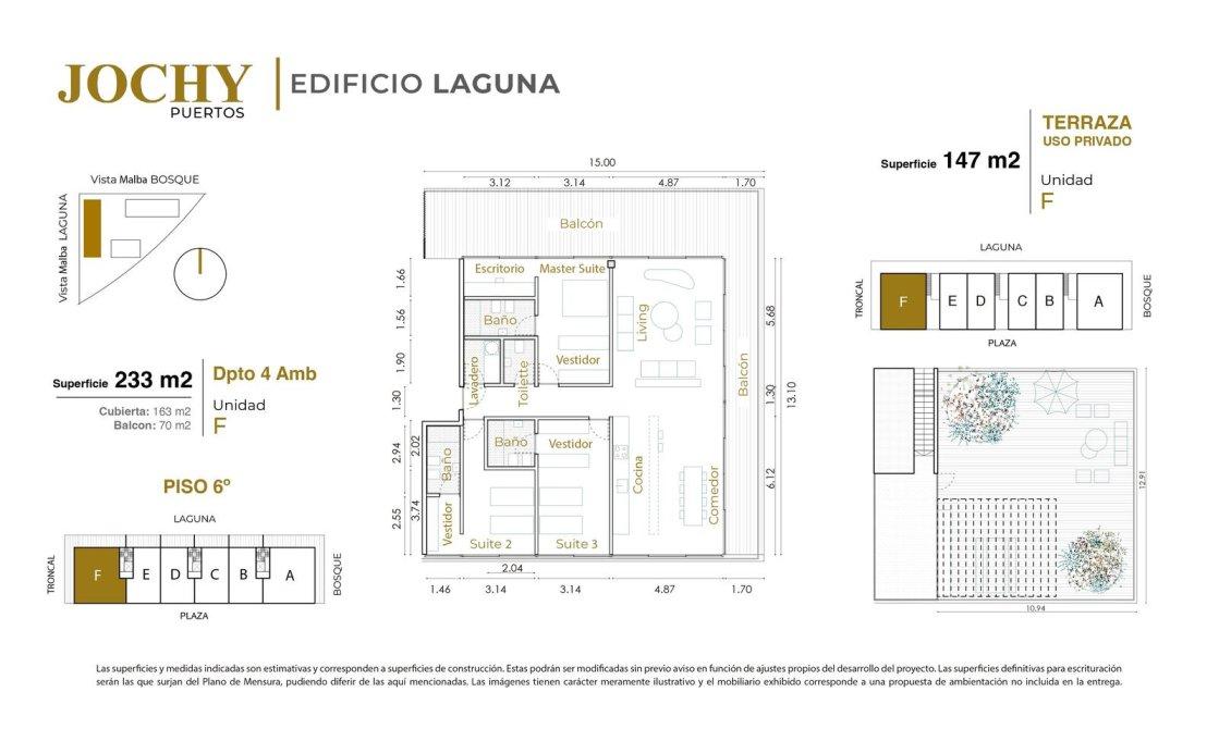 Superficie Total: 233 m² (163 m² Cubiertos + 70 m² Balcón). Superficie Terraza: 147 m².