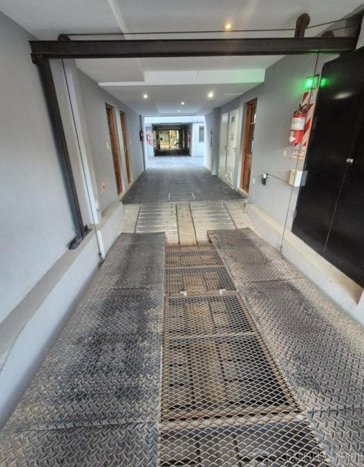 COCHERA SEMICUBIERTA en planta baja. Se encuentra dentro de un edificio de uso habitacional, con acceso peatonal y vehicular con portón automatizado y rampa.