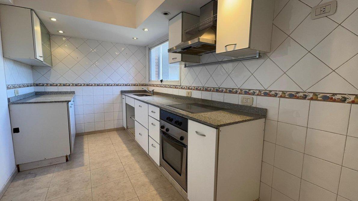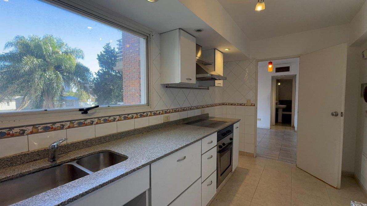 Amplio Living con expansión asía el balcón y vista hacia el jardín parquizado; Cocina comedor diario totalmente equipada (horno y anafe vitrocerámico, eléctricos)