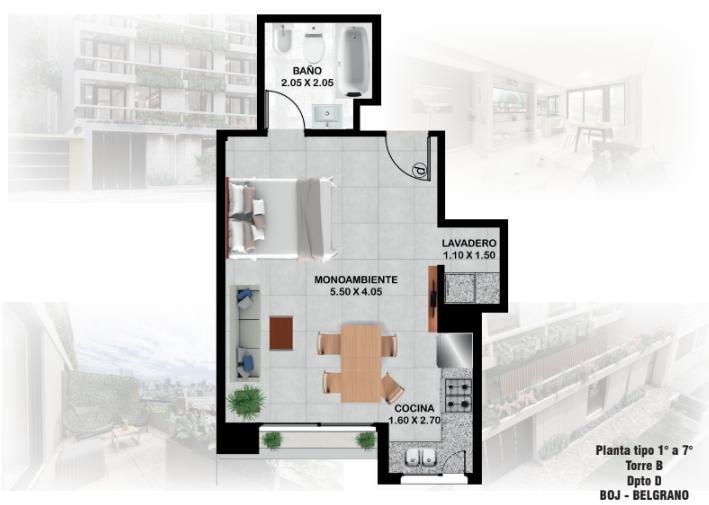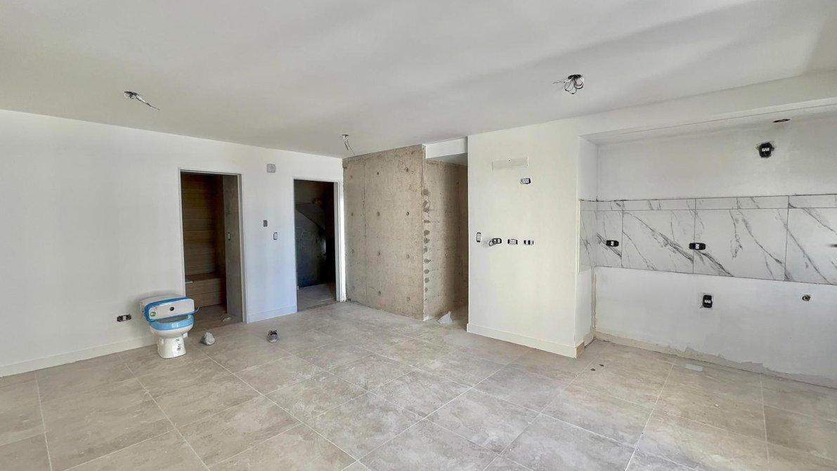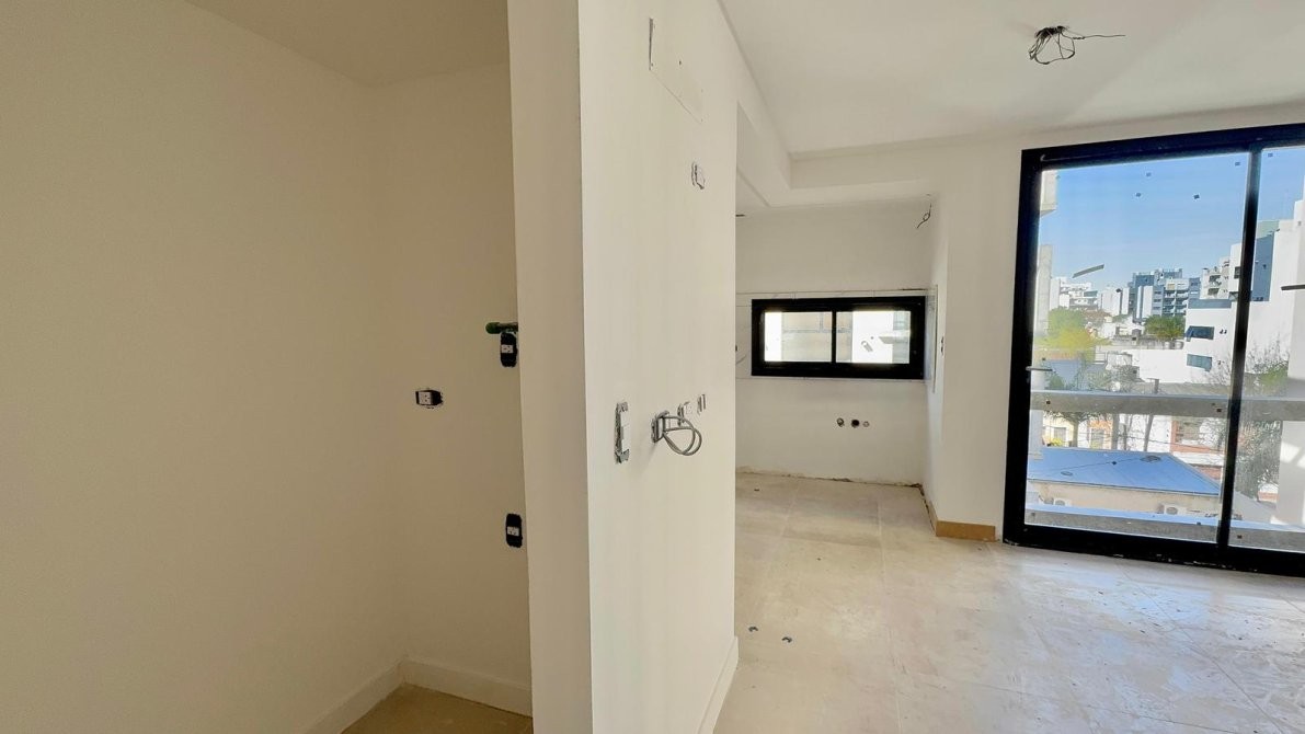 Al ingresar al departamento nos encontramos con la cocina, la cual esta integrada al living-comedor y cuenta con muebles bajo mesada, alacena, mesada de granito con bacha de acero inoxidable y grifería monocomando de primera calidad con un baño completo y acceso directo al balcón.
