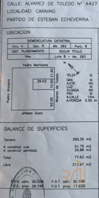 Notas: La información y medidas suministradas son aproximadas y deberán ratificarse con la documentación pertinente, y no compromete contractualmente a nuestra empresa. Las Fotografías provistas no son vinculantes ni contractuales. Pendiente de cumplimentar COTI. Roxana Veltri Gestiones Inmobiliarias CPMCLZ Nº4494 L9 F66