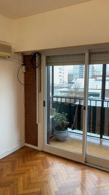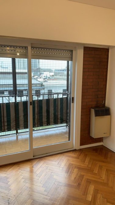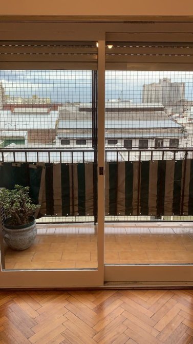 Living comedor con piso de madera y ventanal con salida al balcón, que ofrece una agradable vista lateral a la Av. Belgrano.