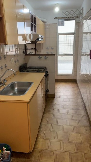 Cocina tipo pasillo, equipada con muebles bajo mesada (2 puertas y 4 cajones), mesada de acero inoxidable con bacha simple y grifería, además de una amplia alacena de 8 puertas.