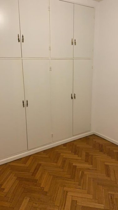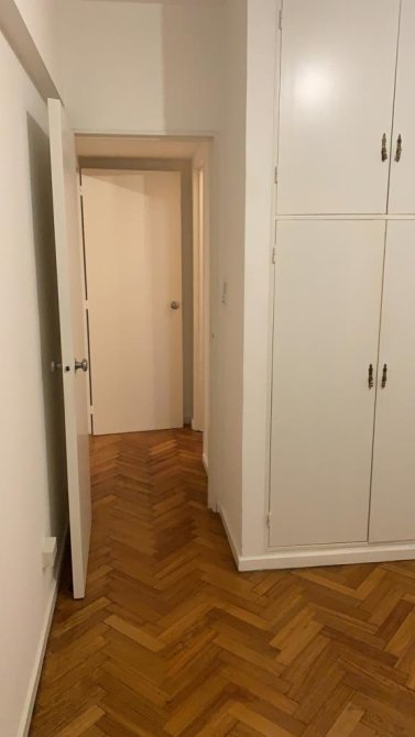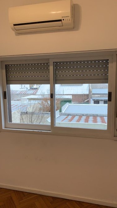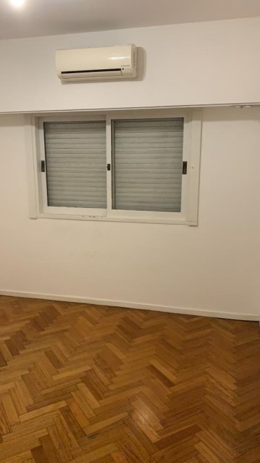 Dormitorio con piso de madera, placard empotrado con baulera y ventana con vista lateral a la avenida.