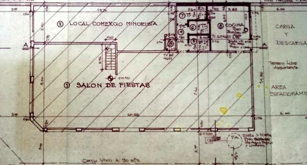 El local mide 8m de frente por 20m55 de fondo, tiene cocina, baño damas, baño caballero y baño discapacitados.