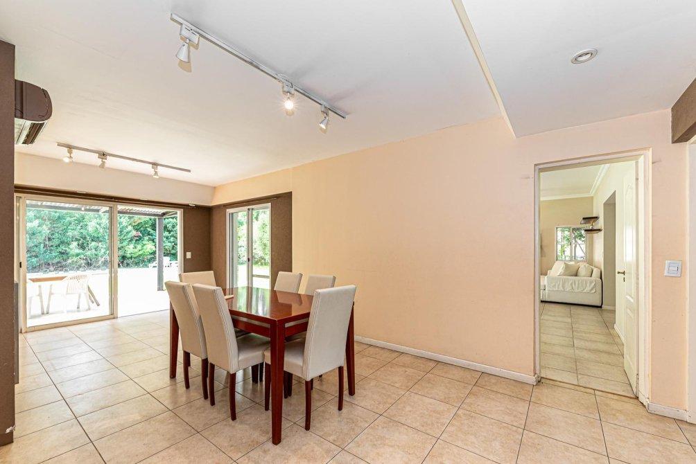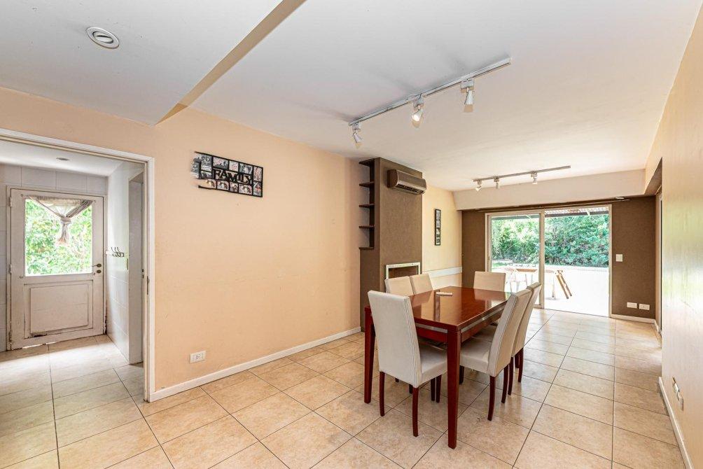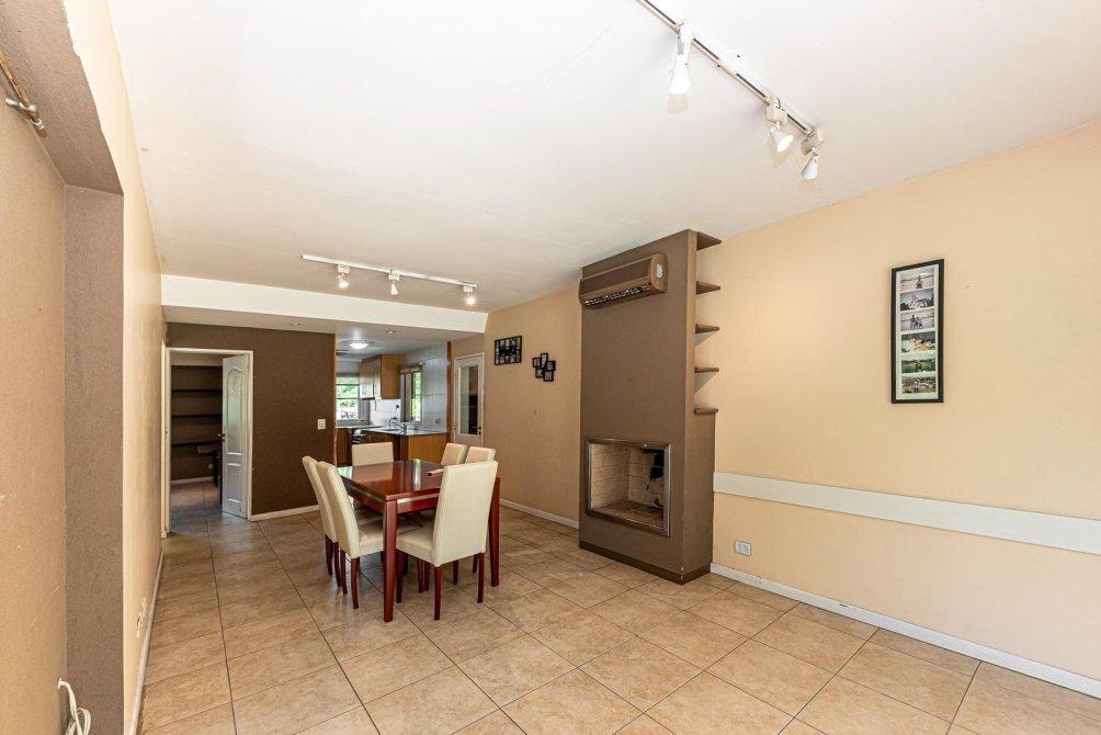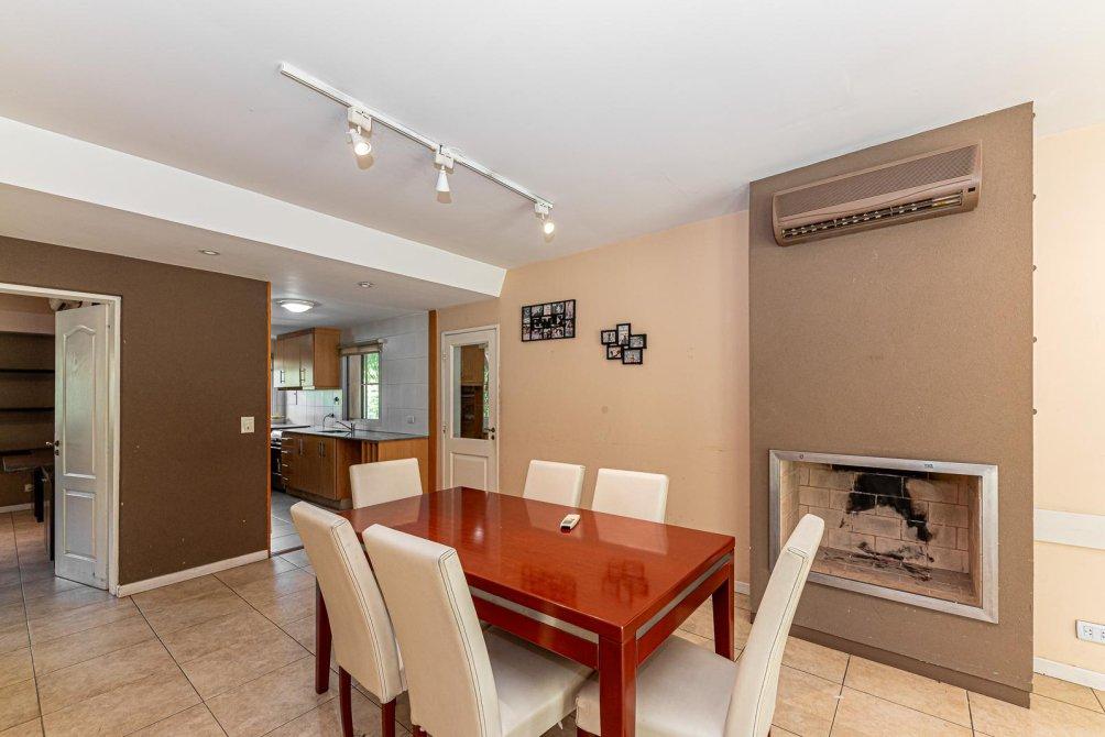 Amplio comedor diario con hogar a leña y vistas al verde.