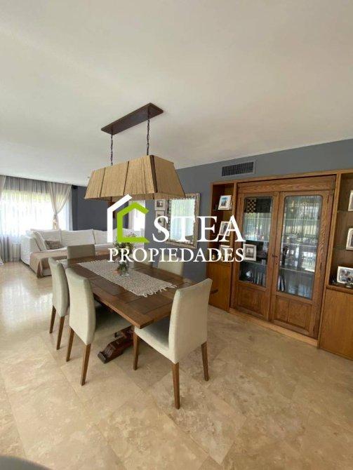 Elegante living-comedor con amplios ventanales y vista al parque.