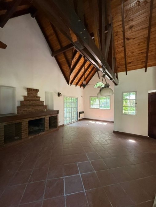 Amplio living-comedor con hogar a leña, perfecto para crear un ambiente cálido.
