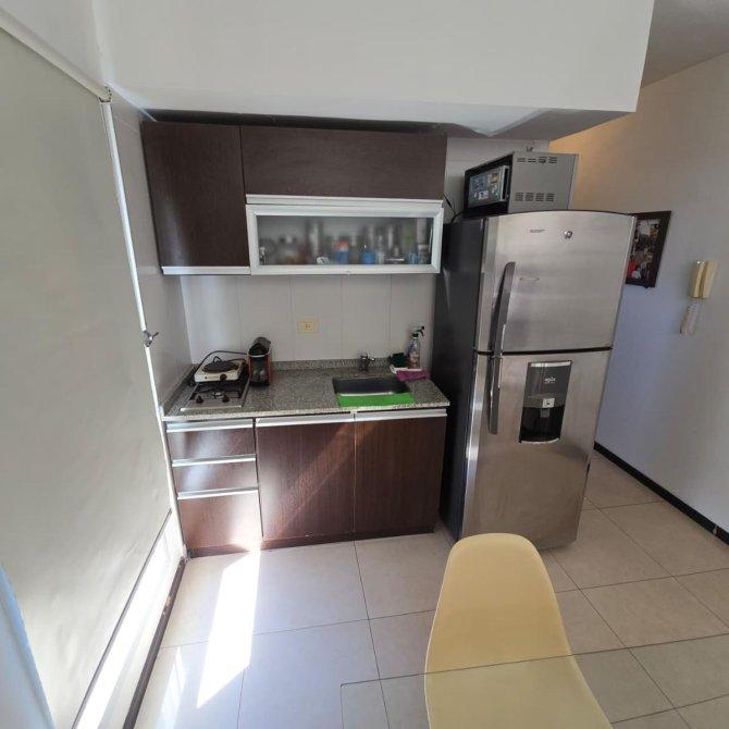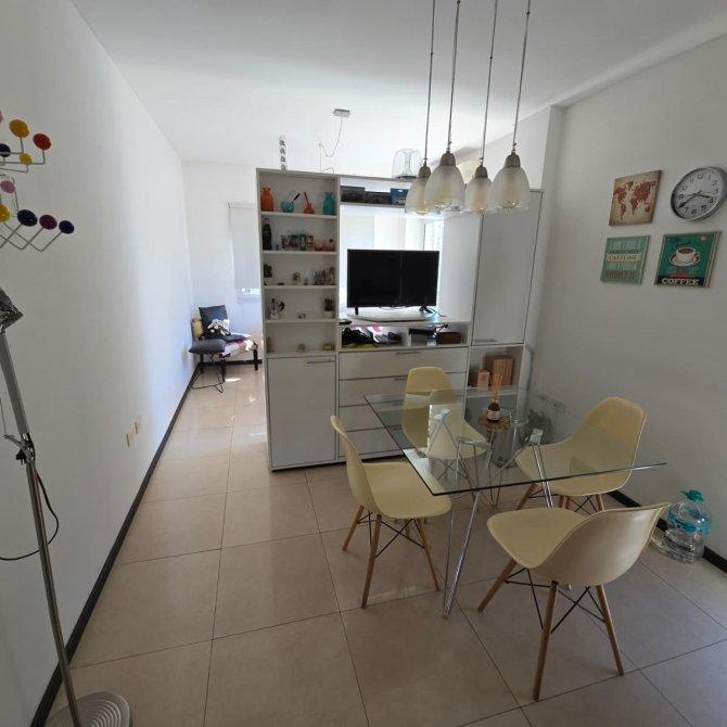 Estar–comedor de 6,30 × 3,00 m, con cocina integrada con bajo mesada, alto mesada, anafe a gas, pisos porcelanato y salida al balcón. Incluye aire acondicionado, mueble divisorio y todas las luminarias instaladas.