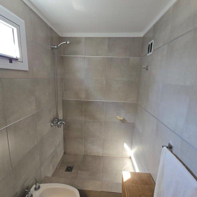 Baño completo de 2,67 × 1,38 m con piso y revestimientos en porcelanato, ducha, inodoro, bidet, pileta y ventana al exterior.