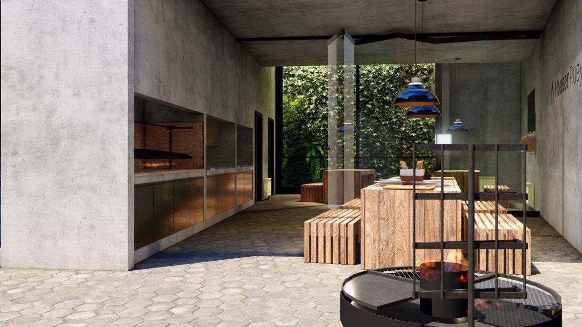 Balcones panorámicos de estar exterior, con vegetación y parrilleros individuales de tirajes mecánicos en todas las unidades.