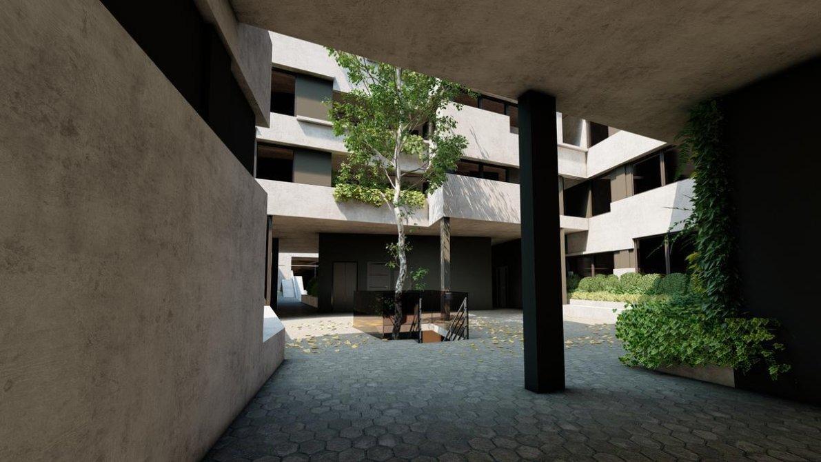 Patio interno con carácter de hall al aire libre. Su uso en planta baja es de distribuidor principal peatonal a todo el edificio, es un espacio a cielo abierto desde donde dirigirse a todos los sectores: recreativos, deportivos y de viviendas. Forestado con jardines verticales, canteros y un árbol que emerge desde el subsuelo cuyo objetivo es oxigenar, silenciar, y dar sombra a este lugar…