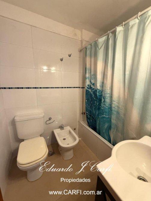 El dormitorio es amplio y luminoso, con placard empotrado con puertas corredizas espejadas. El baño completo dispone de bañera, artefactos sanitarios y griferías en buen estado.