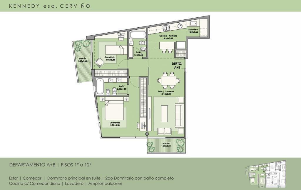 Edificio emplazado en la esquina de Kennedy y Av. Cerviño. Cochera cubierta en subsuelo mediante auto elevador, Pileta, Hidromiel y SUM con parrilla en el último piso. Laundry con lavarropas y secarropas. Seguridad con Totem.