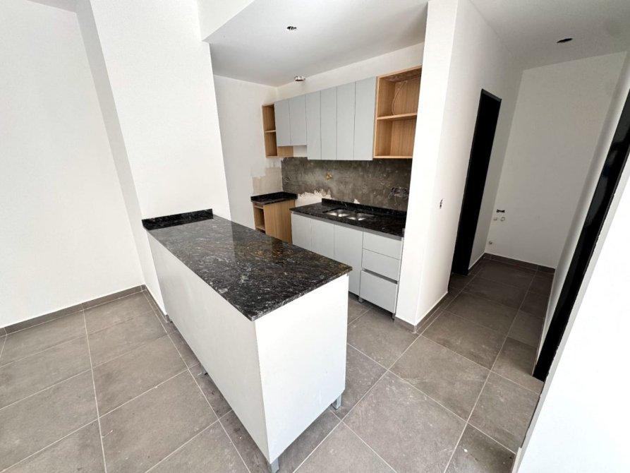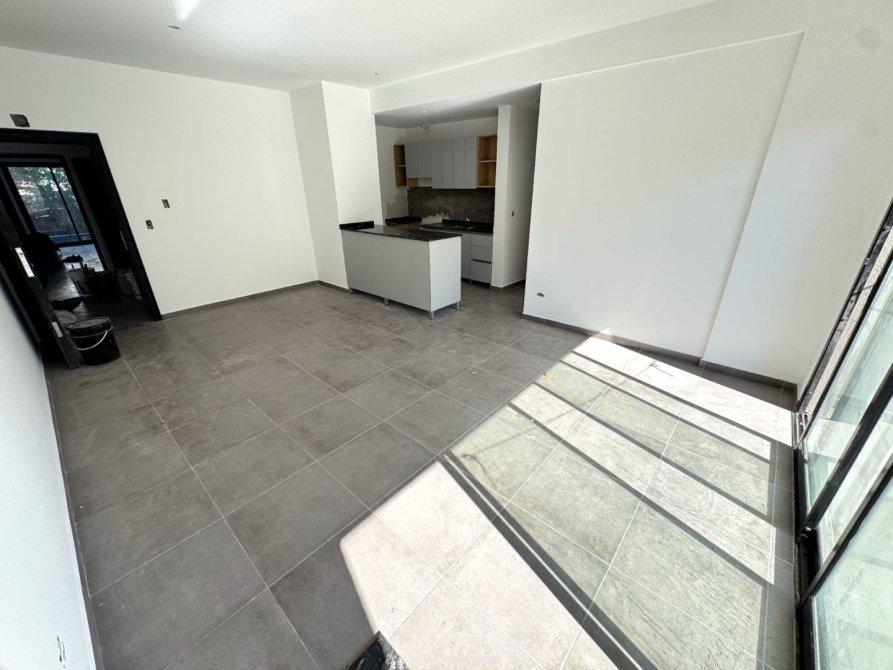 El departamento al ingresar cuenta con la cocina integrada y una isla desayunadora, terminaciones de 1ra calidad, griferías marca ferrum, preinstalación de AC, pisos de porcelanato en todos sus ambientes y amplia habitación con las puertas de placares ya integradas