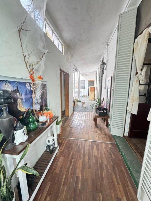 La propiedad actual se compone de un jardín delantero, ingreso por pasillo distribuidor que conecta cuatro habitaciones con la galería y el patio central.