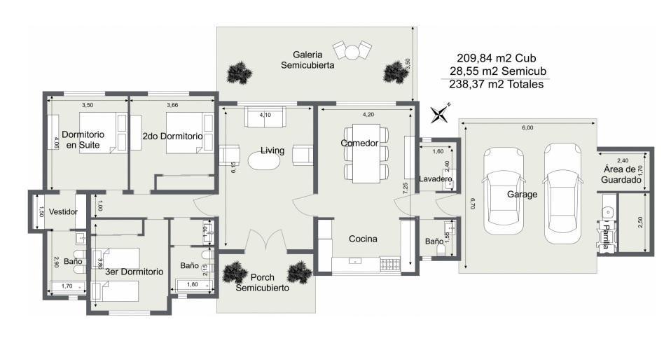 Con un total de 238,37 m2, de los cuales 209,84 m2 son cubiertos.