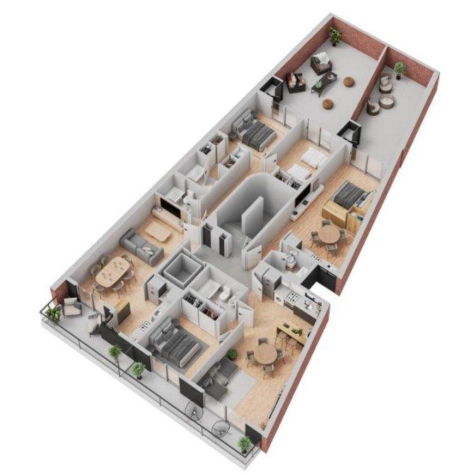 Se desarrolla en planta baja y 8 pisos, con unidades monoambientes, 1 y 2 dormitorios, todas con balcones, excelente distribución y ventilación cruzada. En la planta baja se ubican cocheras y un local comercial. El último nivel cuenta con terraza exclusiva, un quincho cubierto con parrillero y solarium con minipiscina.