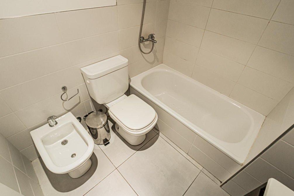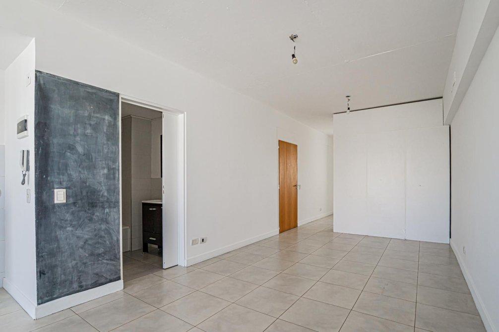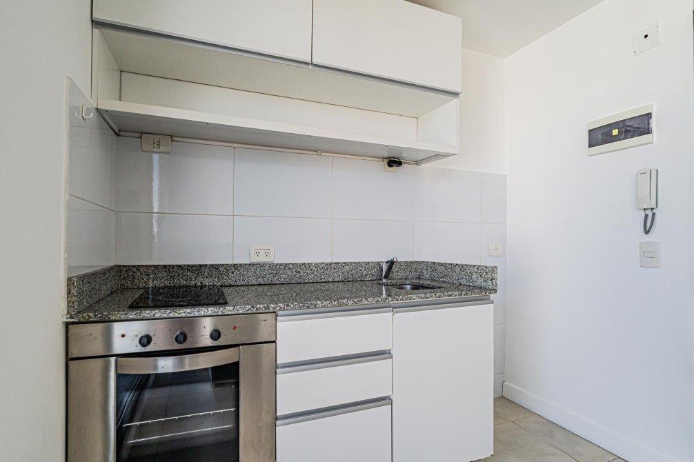 El departamento tiene cocina integrada equipada con anafe y horno eléctricos, isla desayunadora, placard divisor que permite organizar el espacio, baño completo, aire acondicionado y cortinas black out. Agua caliente central.