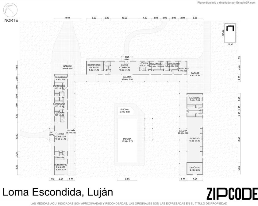 10.074 m² superficie de lote (según escritura) – Frente/Fondo aprox.: 76,50 m x 132,00 m