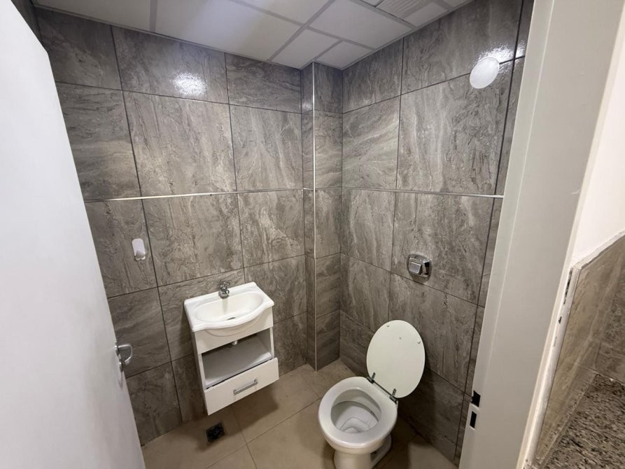 El toilette es moderno, con revestimientos en porcelanato símil piedra y vanitory de diseño.