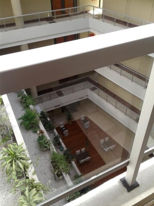 El edificio se caracteriza por su estética corporativa moderna, con espacios comunes iluminados, ascensores y acceso controlado.