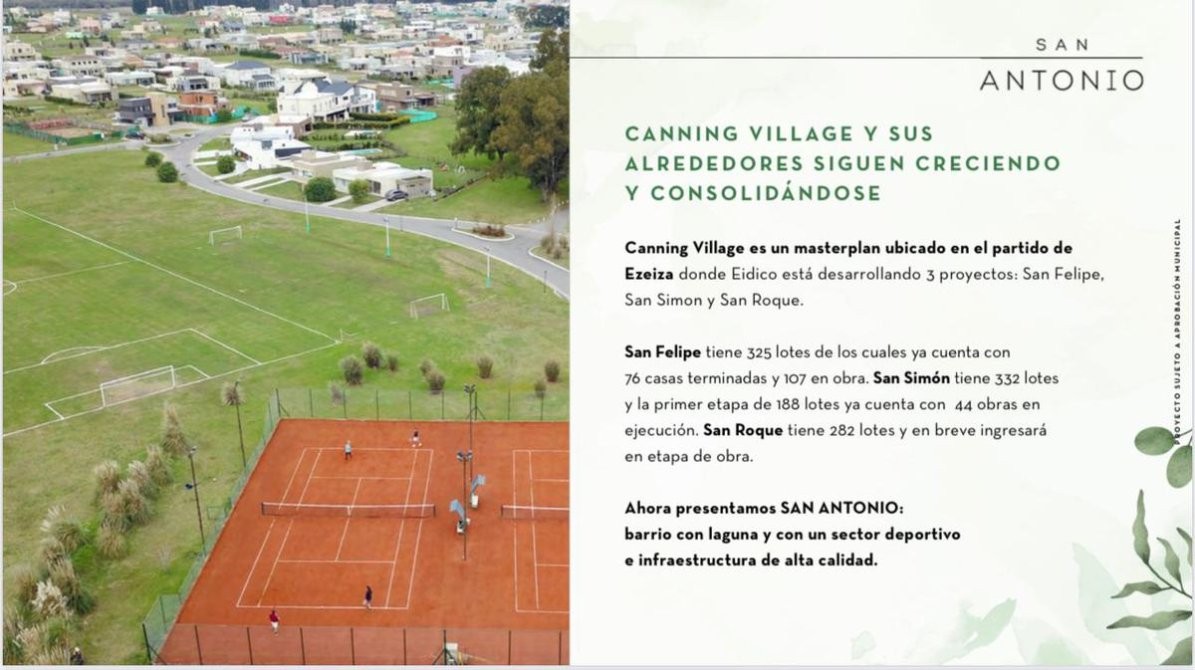 Canning Village es un masterplan ubicado en el partido de Ezeiza, se encuentra entre las rutas 58 y 52 a través de un boulevard de conectividad para ambas rutas, donde Eidico ya desarrolló 2 proyectos: San Felipe y San Simón I, II y III. San Felipe tiene 325 lotes de los cuales ya cuenta con 14 familias viviendo y 100 casas en obra. San Simón tiene 332 lotes y la primera etapa de 188 lotes ya cuenta con 22 obras en ejecución y 10 en proceso de inicio.