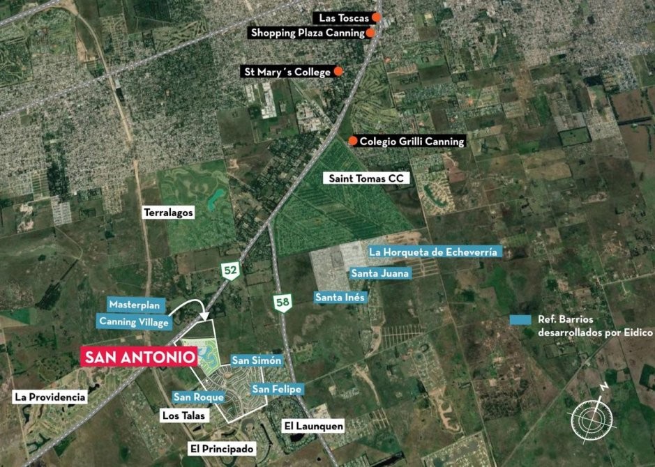 Canning Village es un masterplan ubicado en el partido de Ezeiza, se encuentra entre las rutas 58 y 52 a través de un boulevard de conectividad para ambas rutas, donde Eidico ya desarrolló 2 proyectos: San Felipe y San Simón I, II y III. San Felipe tiene 325 lotes de los cuales ya cuenta con 14 familias viviendo y 100 casas en obra. San Simón tiene 332 lotes y la primera etapa de 188 lotes ya cuenta con 22 obras en ejecución y 10 en proceso de inicio.