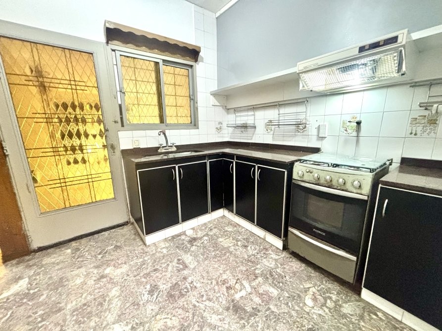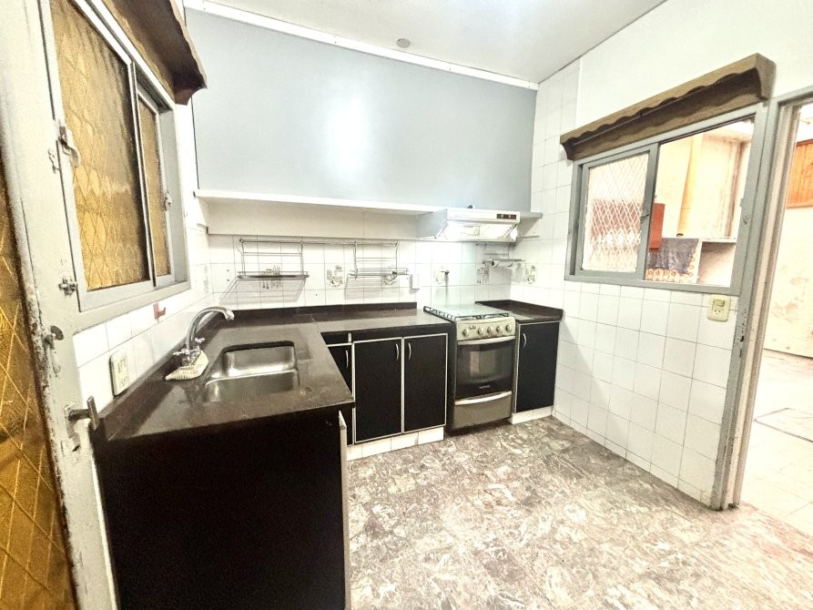 Hacia el lado izquierdo del living se ubica la cocina, equipada con muebles bajo y sobre mesada. La cocina posee salida directa a la cochera y una puerta con ventana hacia un patio interno, donde se encuentra el lavadero y que además aporta ventilación a uno de los dormitorios y al baño.