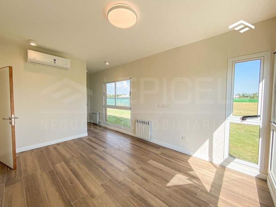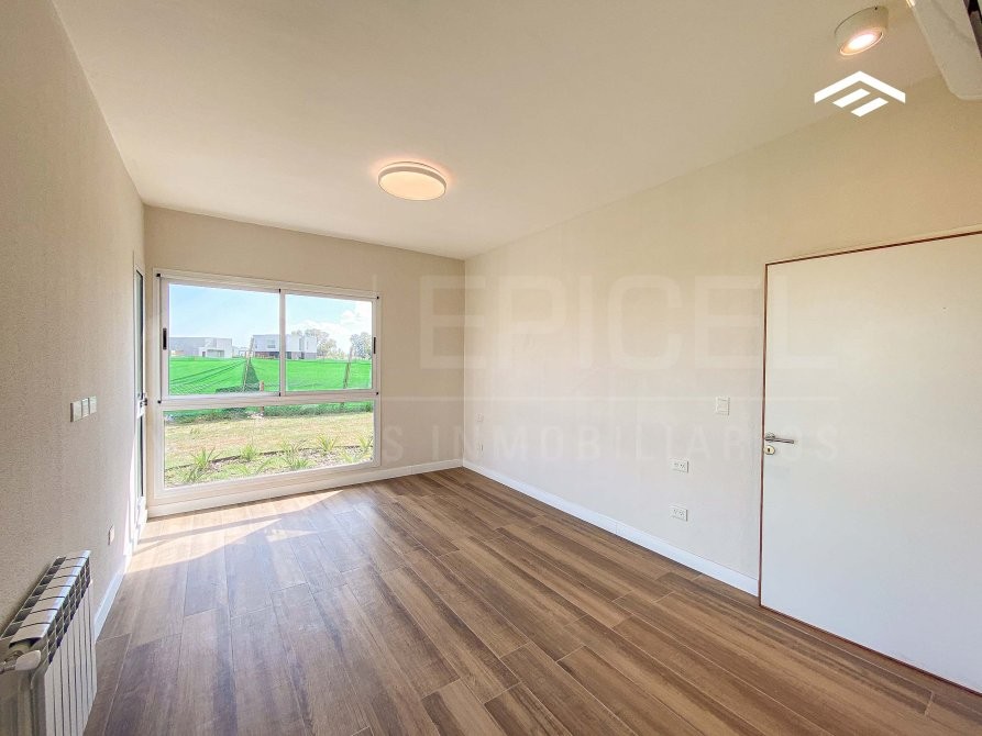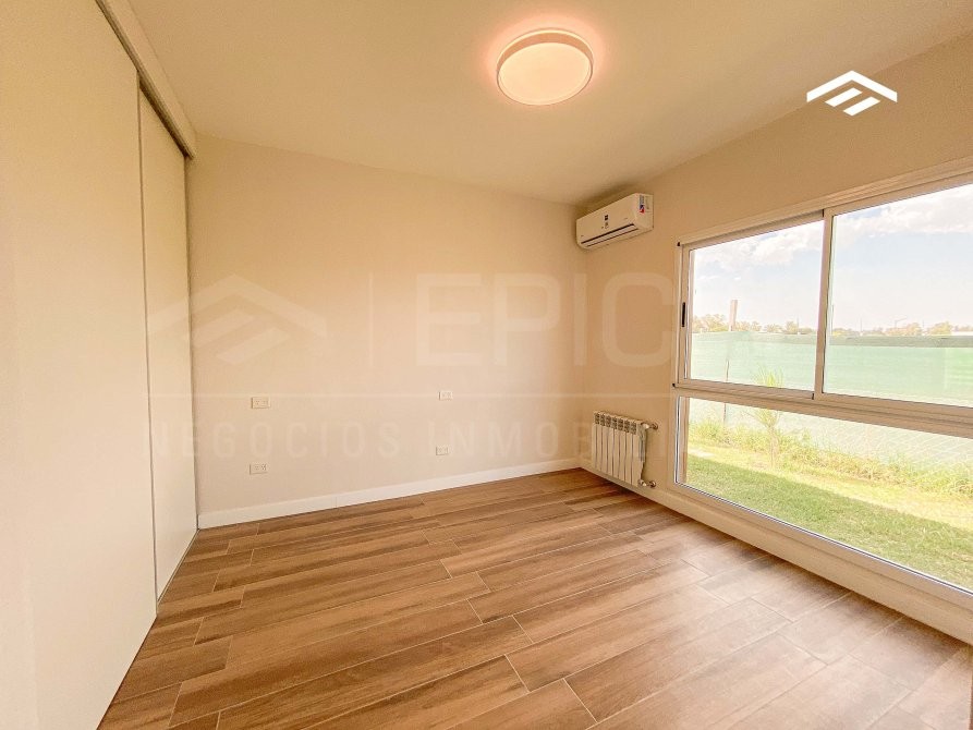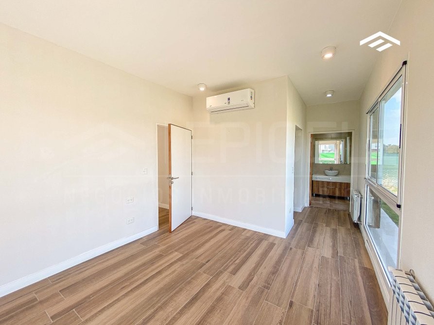 Dormitorio principal en suite, con espacio para vestidor y vista al jardín. Baño completo con vanitory, inodoro, bidet, box de ducha con mampara y toallero. Split inverter Blue Star.