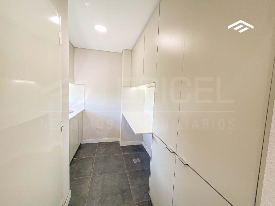 Desde la cocina, mediante una puerta granero, se accede al lavadero independiente, equipado con mesada de Silestone, bacha Johnson, alacena, bajo mesada, instalaciones para lavarropas y secarropas, y caldera dual BAXI.