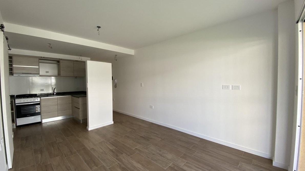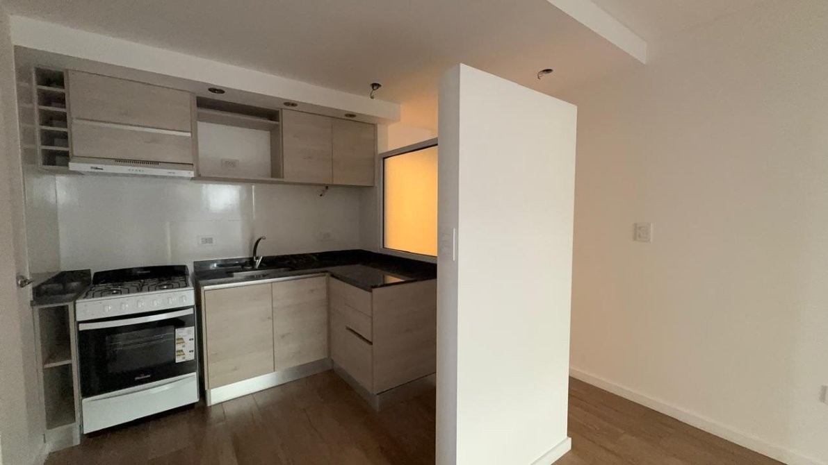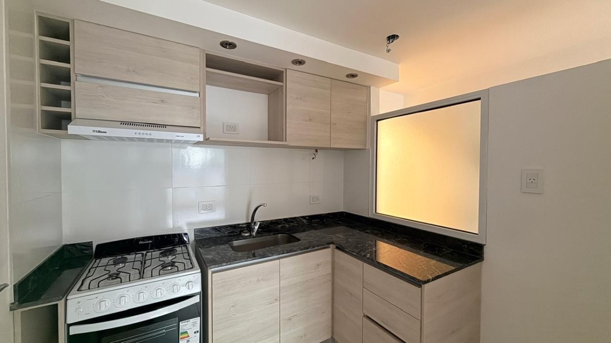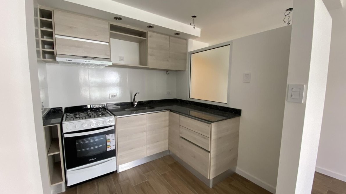 La cocina totalmente amobladas con bajo mesada y alacenas de primera calidad, cocina a gas Longvie, luminarias, pisos de porcelanato simil madera entablonados, aberturas de aluminio de altas prestaciones. paredes enlucidas en yeso.