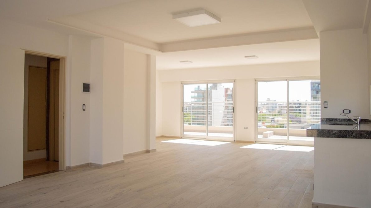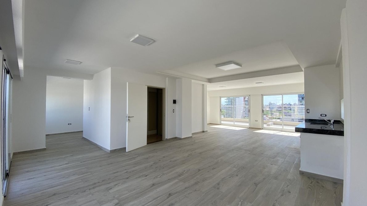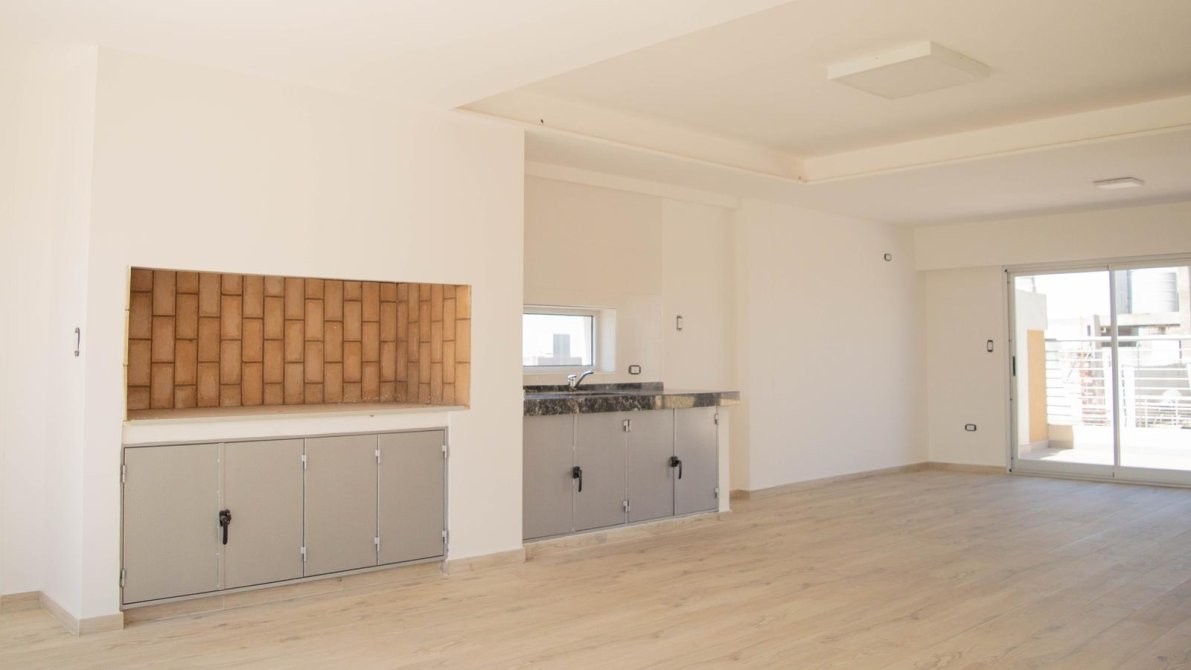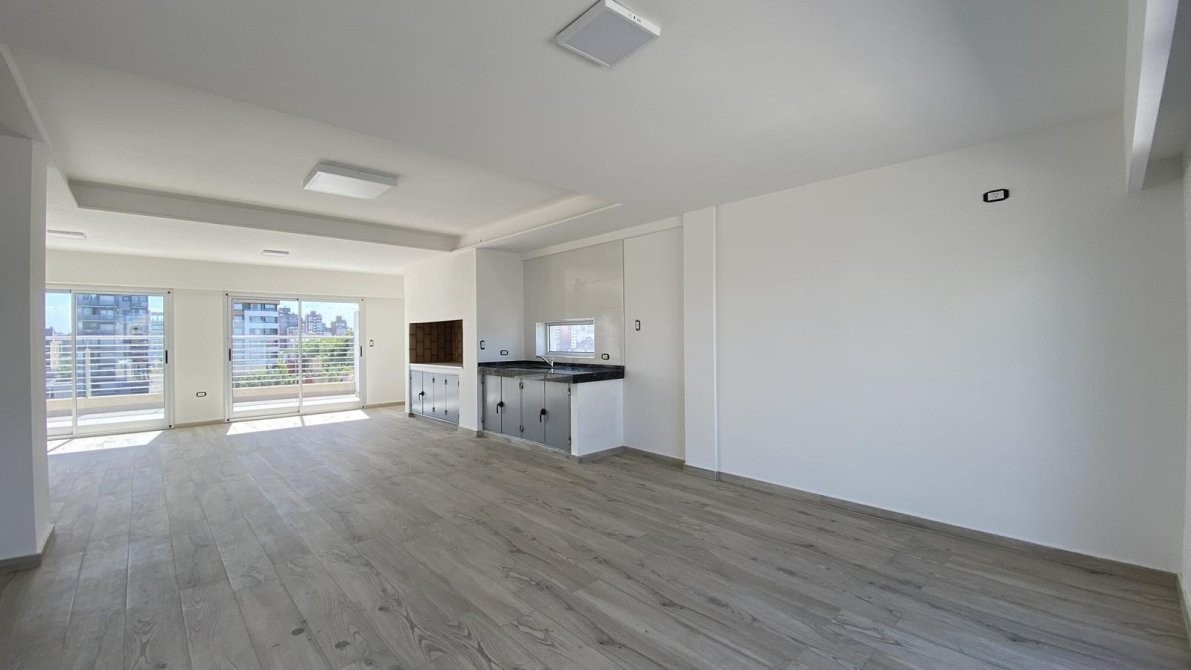 La cocina totalmente amobladas con bajo mesada y alacenas de primera calidad, cocina a gas Longvie, luminarias, pisos de porcelanato simil madera entablonados, aberturas de aluminio de altas prestaciones. paredes enlucidas en yeso.