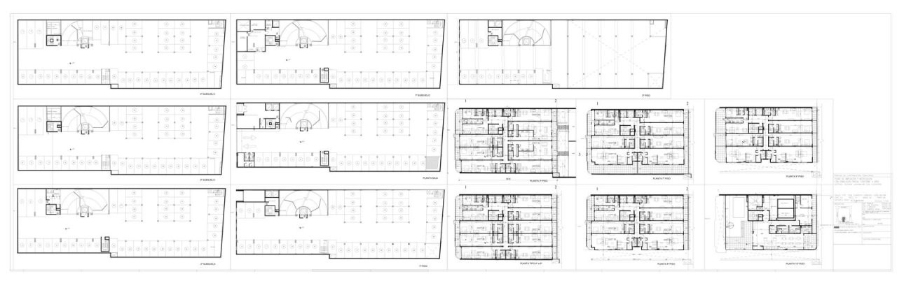 Como basamento del edificio se desarrolla un garage de gran escala, actualmente en pleno funcionamiento: