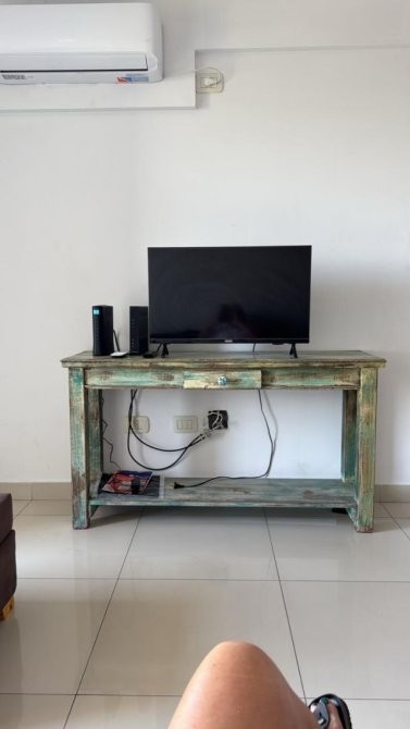 -heladera, horno, pava eléctrica, barra desayunadora con 4 sillas, sillón, mesa para TV, aire fríocalor y cama para dos personas.