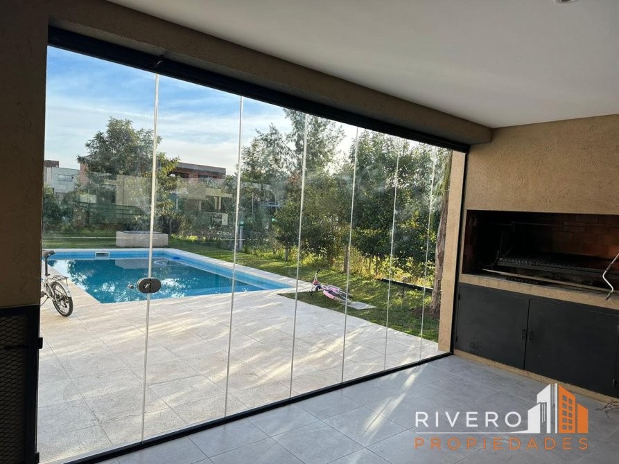 El exterior de la casa es un verdadero oasis, con una galería que incluye parrilla, una refrescante piscina y un amplio parque arbolado que brinda un entorno natural y relajante. Los servicios adicionales como aire acondicionado, calefacción, e internet  garantizan una experiencia de vida confortable. La propiedad también cuenta con 2 cocheras descubiertas y diversas instalaciones del barrio, como canchas de fútbol, tenis y polideportivas, además de un Club House y juegos recreativos, lo que la convierte en un espacio ideal para disfrutar en familia.