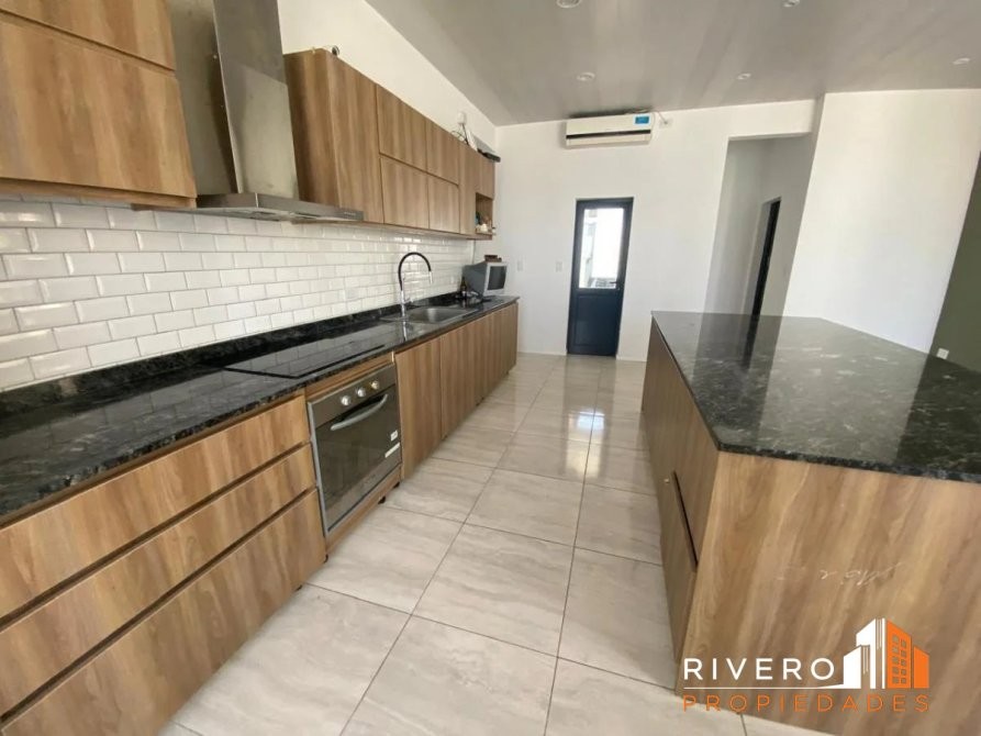 La cocina integrada cuenta con muebles bajo y sobre mesada, horno y anafe, además de una elegante campana de acero inoxidable y una espectacular isla con mesada de mármol, ideal para disfrutar de momentos en familia.