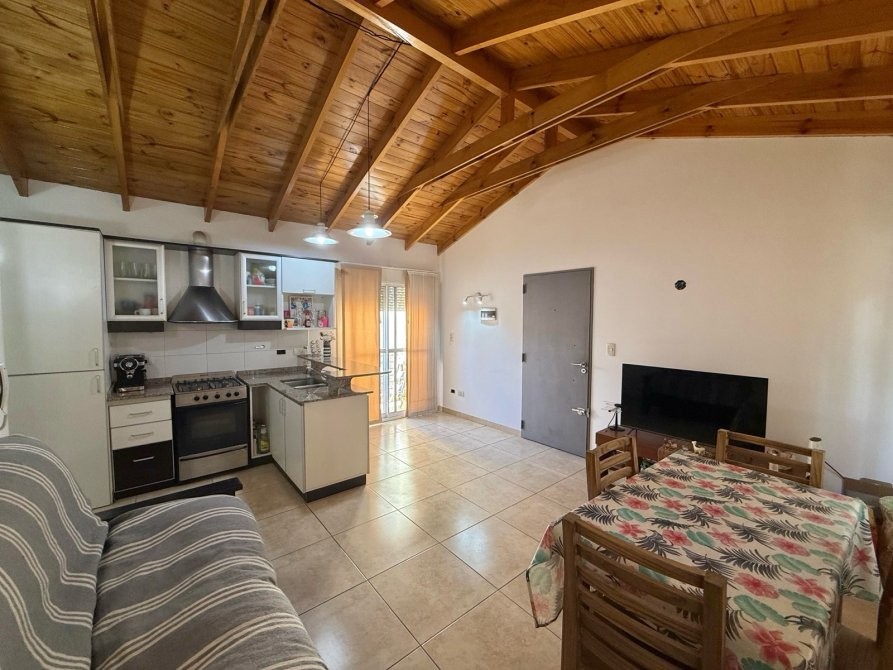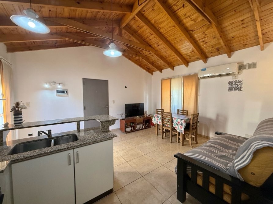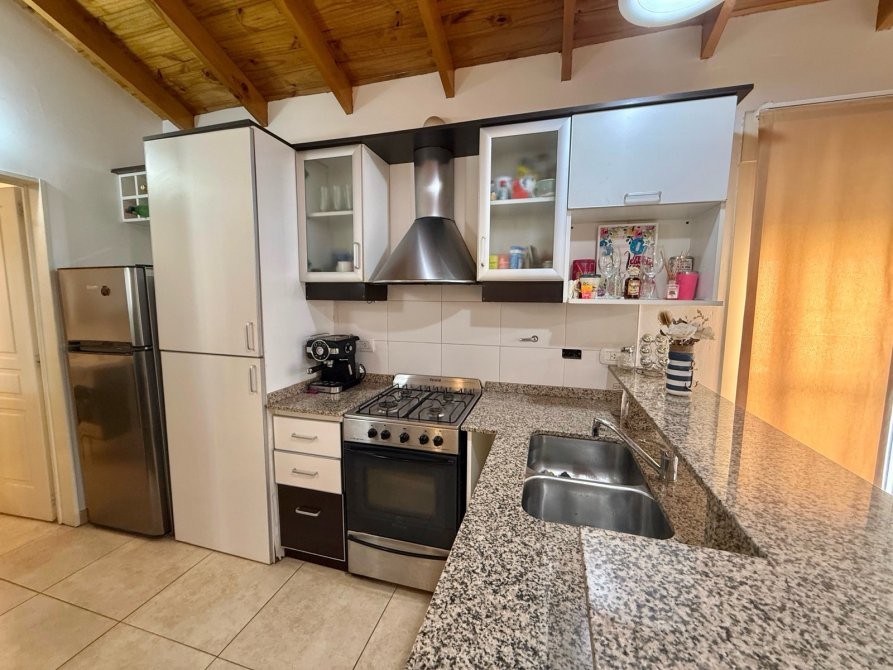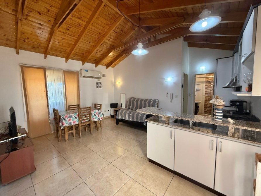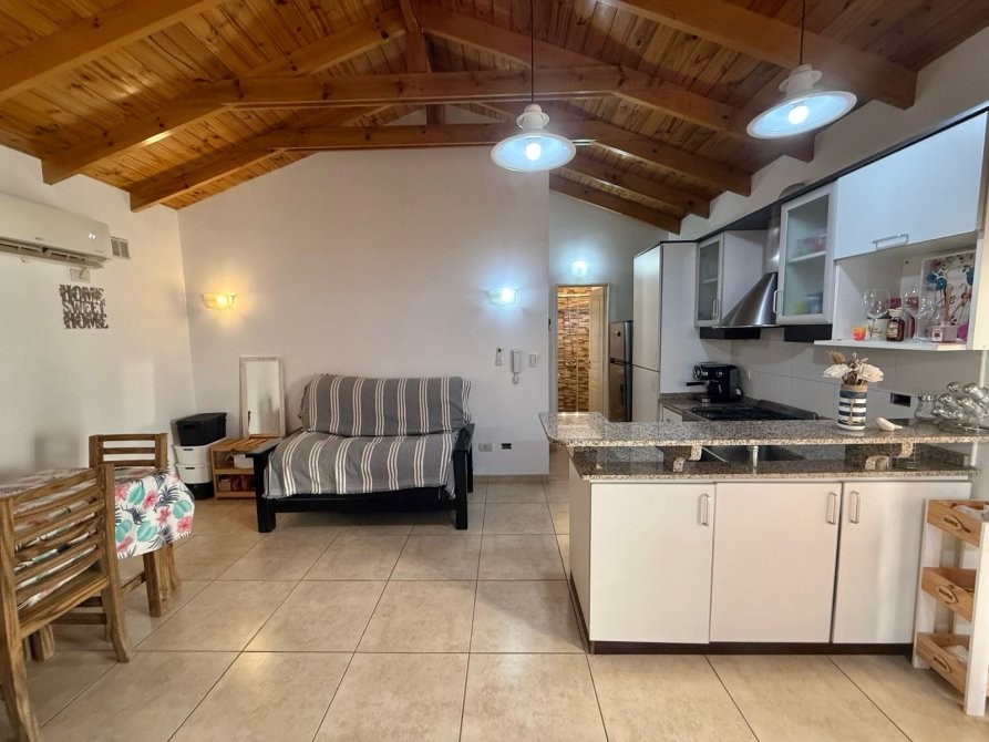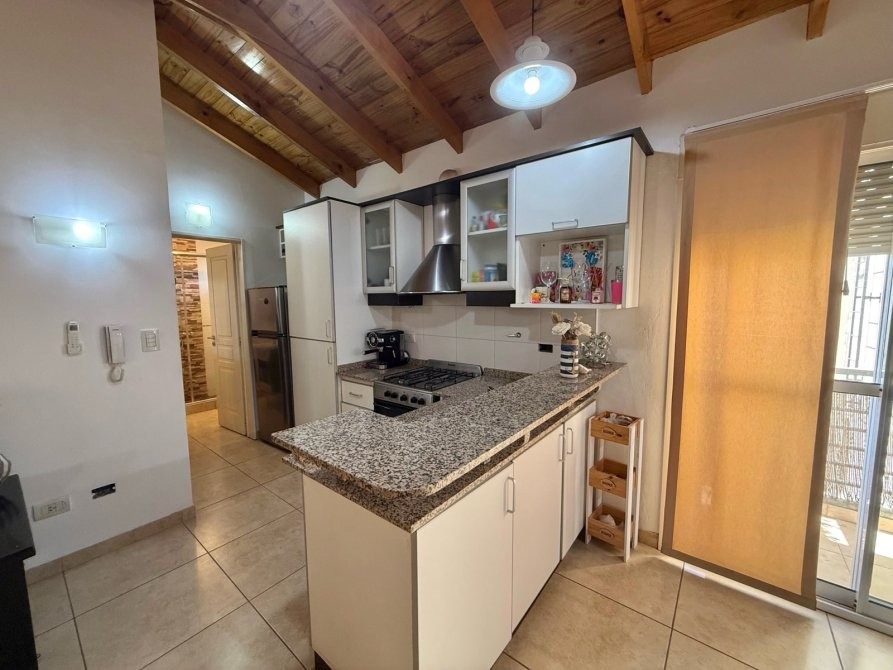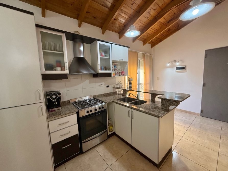 - Cocina integrada al living con amoblamiento completo alacena, bajo mesada, barra desayunadora y artefacto de cocina a gas.