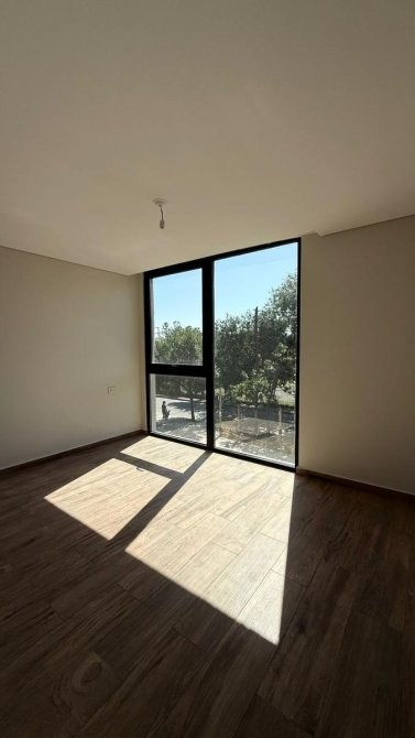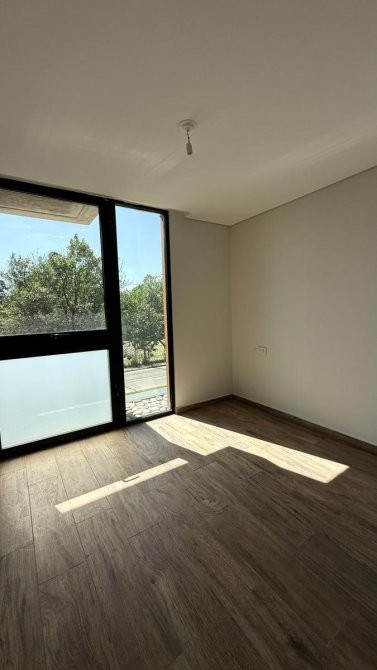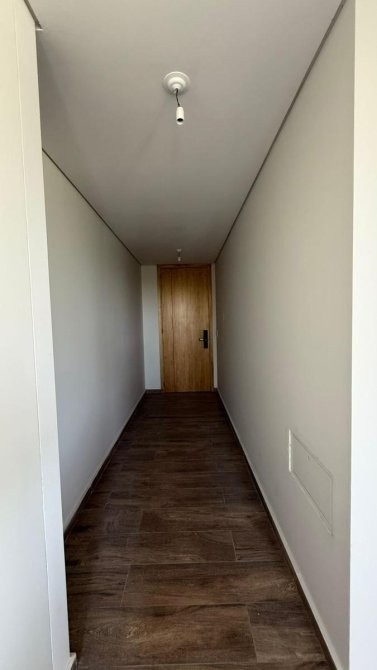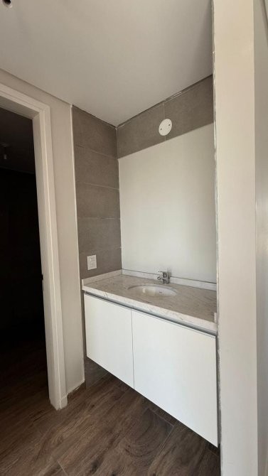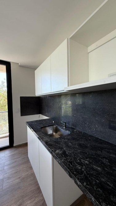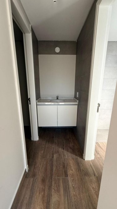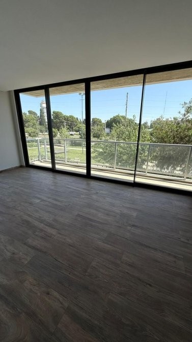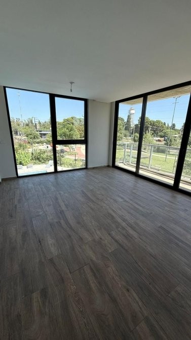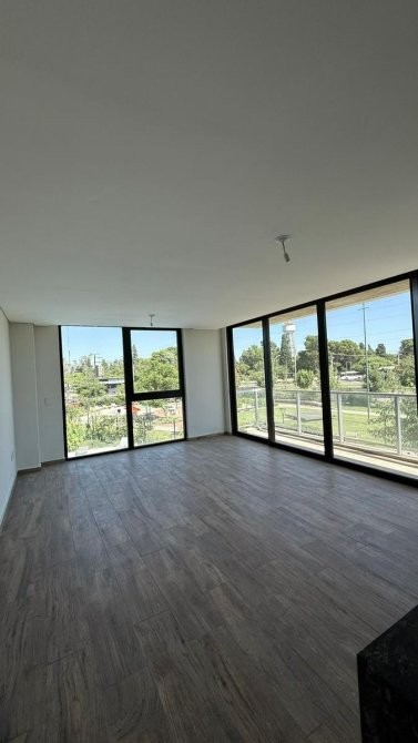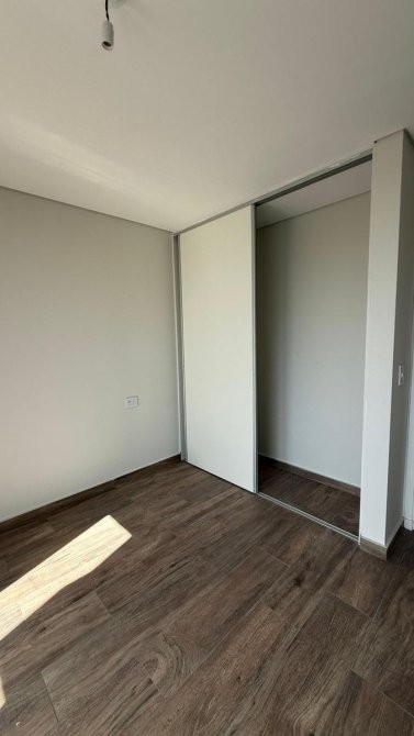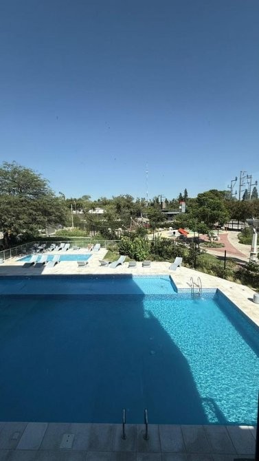 La unidad en venta se desarrolla de la siguiente manera: un hall de ingreso que da paso a una cocina equipada con bajo mesada y alacenas, además de instalación para lavarropas y anafe eléctrica, con acceso al balcón. El estar comedor dispone de un ventanal con vista a la plaza del complejo y la pileta, complementado con una doble ventana que también lleva al balcón.