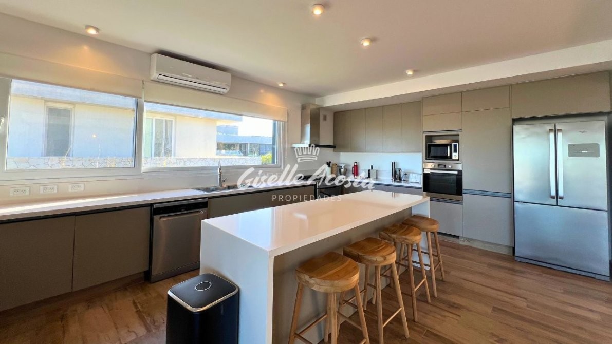 - Cocina separada por una isla desayunadora y con espacio de guardado. Equipada con cocina 5 hornallas, horno eléctrico, lavavajillas, heladera Whirlpool, microondas, pequeños electros, cafetera Nespresso.