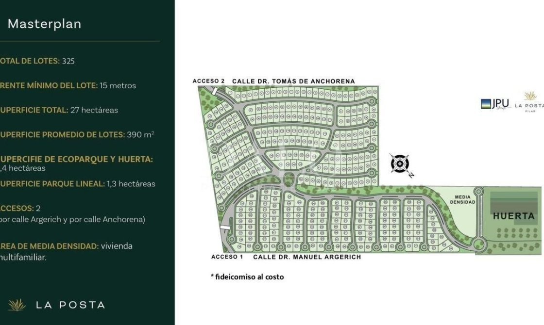 FAG. LOTE PERIMETRAL EN VENTA! Lote 38 - Perimetral - orientación Noroeste. "La Posta Pilar" es un nuevo barrio privado ubicado en Pilar, a solo 1,2 km de la Panamericana Ramal Pilar ¹. Este desarrollo inmobiliario ofrece una nueva forma de vida en comunión con la naturaleza y el entorno urbano ². El barrio cuenta con 325 lotes de aproximadamente 410 metros cuadrados cada uno, distribuidos en un predio de 27 hectáreas ¹. Además, dispone de un parque lineal forestado, áreas de recreo, una huerta orgánica comunitaria y un espacio de 9.000 metros cuadrados de media densidad ¹. Espacios verdes y recreativos: Parque lineal forestado con especies nativas. Áreas de recreo y esparcimiento para adultos y niños. Huerta orgánica comunitaria para fomentar la producción local y el consumo sostenible. Seguridad: Barrio cerrado con control de acceso y seguridad privada las 24 horas. Circuito cerrado de televisión para monitorear el barrio. Infraestructura y servicios: Calles pavimentadas y alumbradas. Red de agua potable y cloacas. Conexión a la red eléctrica y de gas natural. Acceso a Internet y servicios de telecomunicaciones. Ubicación y accesibilidad: Ubicado en Pilar, a solo 1,2 km de la Panamericana Ramal Pilar. Acceso fácil a rutas y autopistas principales. Cercanía a centros comerciales, escuelas, hospitales y otros servicios. Otras características: Arquitectura de baja densidad para preservar la naturaleza y el entorno. Espacios de estacionamiento para residentes y visitantes. Posibilidad de personalizar las viviendas según las necesidades y gustos de cada familia.