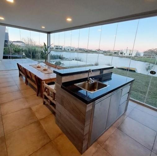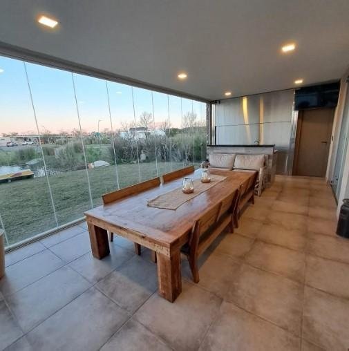 La galería vidriada es un punto fuerte: podés usarla todo el año, con vista al verde y a la pileta tipo infinita que le da un toque espectacular al jardín, rodeado de palmeras que generan una onda bien relajada.