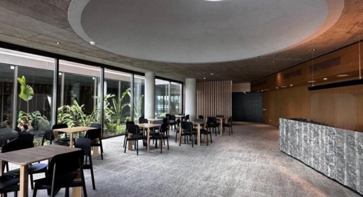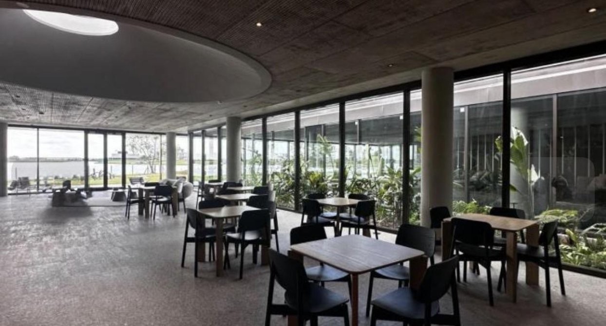 El brochure describe un edificio de líneas horizontales paralelo al lago, donde la luz natural y la ventilación son protagonistas. Su morfología de curvas y contracurvas genera expansiones equivalentes hacia el acceso (Este) y hacia el lago (Oeste), organizando jardines, recorridos y áreas comunes con una relación permanente con el agua. ?